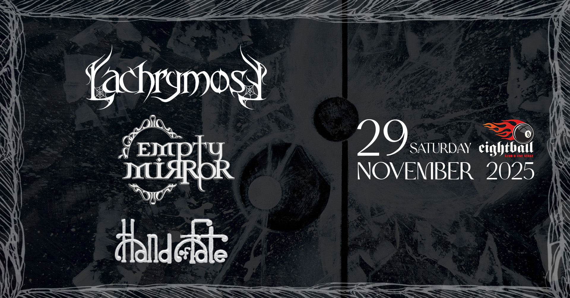 Το Σάββατο 29 Νοεμβρίου οι Lachrymose, Empty Mirror και Hand of Fate σας προσκαλούν στη σκηνή του Eightball για μια μοναδική gothic/doom βραδιά.