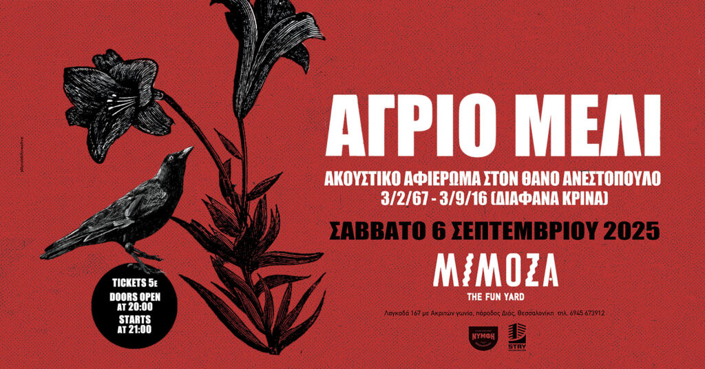 Ένα βράδυ γεμάτο μνήμες, ποίηση και μουσική στη Μιμόζα. Το Άγριο Μέλι παρουσιάζει ένα ακουστικό αφιέρωμα στον Θάνο Ανεστόπουλο (Διάφανα Κρίνα), τον τελευταίο «σκοτεινό ποιητή» του ελληνικού τραγουδιού.