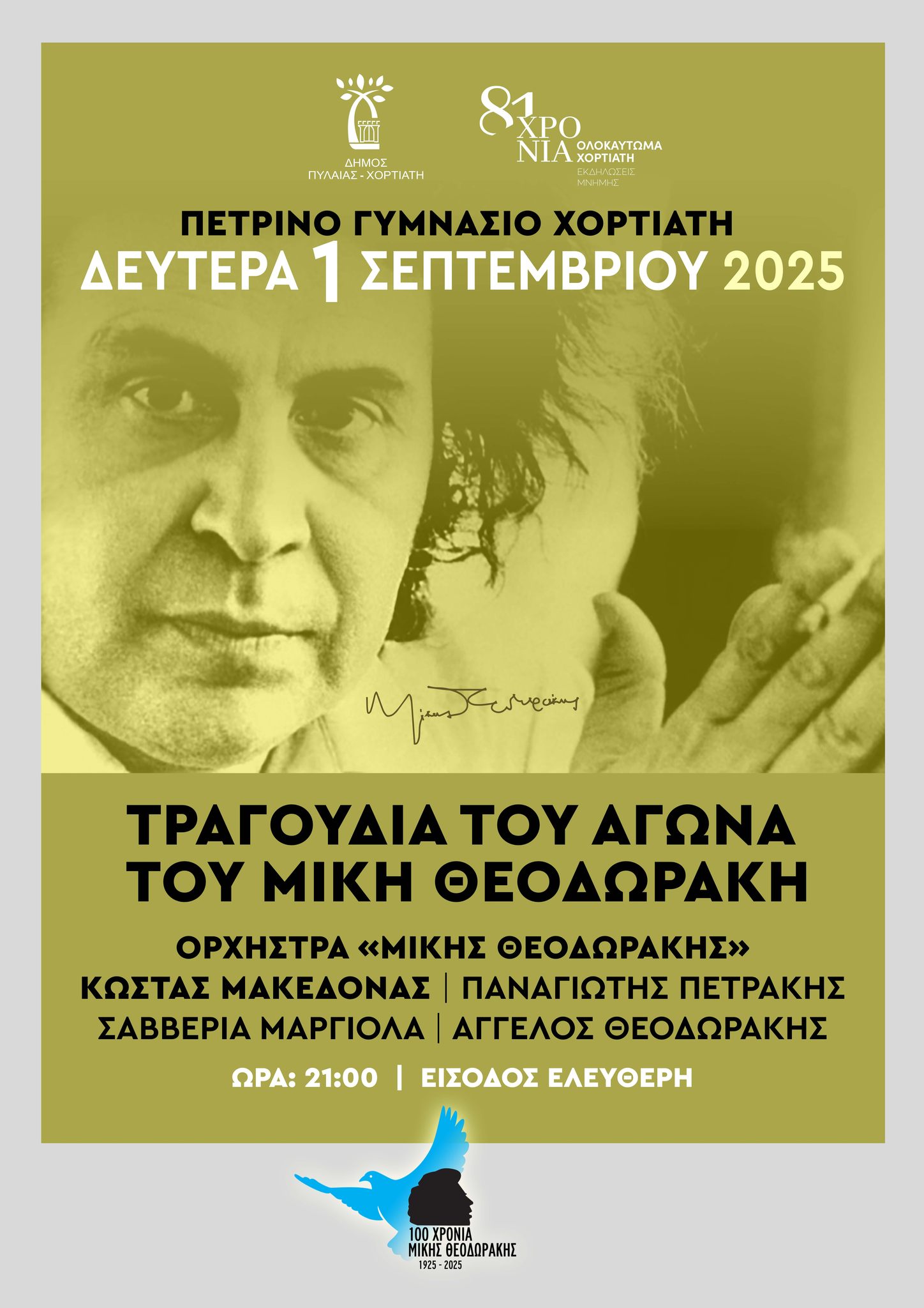 Μεγάλη συναυλία Λαϊκής Ορχήστρας «Μίκης Θεοδωράκη» θα πραγματοποιηθεί τη Δευτέρα 1 Σεπτεμβρίου, στις 9 το βράδυ, στο Πέτρινο Γυμνάσιο του Χορτιάτη, στο πλαίσιο των εκδηλώσεων για την 81η επέτειο του Ολοκαυτώματος του Χορτιάτη. Θα απολαύσουμε τα Τραγούδια του Αγώνα του μεγάλου Μίκη Θεοδωράκη με την χαρισματική φωνή του Κώστα Μακεδόνα, που θα έχει δίπλα του στη σκηνή τη Σαββέρια Μαργιολά, τον Παναγιώτη Πετράκη και τον Άγγελο Θεοδωράκη