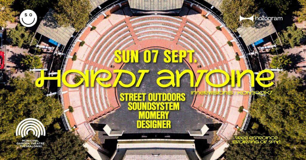 Το ανοιχτό θέατρο μεταμορφώνεται σε dancefloor και φιλοξενεί για πρώτη φορά στη Θεσσαλονίκη τον Λονδρέζο Hardt Antoine (Innervisions / Kompakt), μαζί με τους Street Outdoors Soundsystem, Momery & Designer.
