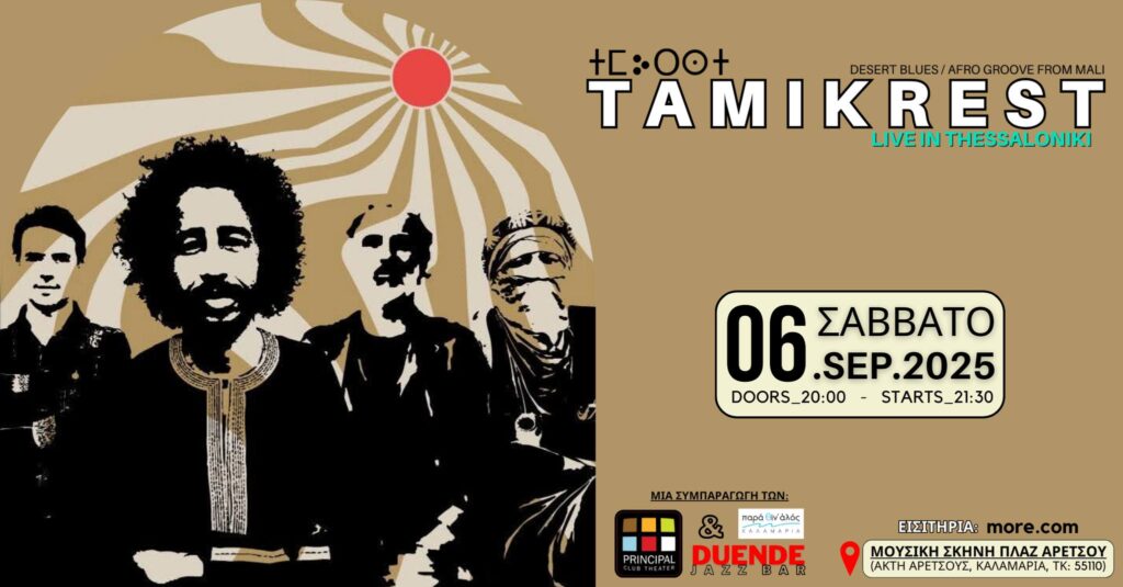 Ένας από τους σημαντικότερους εκπροσώπους των blues της μεγάλης ερήμου τα τελευταία χρόνια, με σήμα κατατεθέν την ιδιαίτερη μίξη της παραδοσιακής μουσικής των Touareg της ερήμου Σαχάρα με σύγχρονα στοιχεία της ροκ μουσικής, και αγαπημένοι του μουσικόφιλου κοινού της Θεσσαλονίκης, οι Tamikrest από το Mαλι της Δυτικής Αφρικής, επιστρέφουν για 3η φορά στα μέρη μας. Αυτή τη φορά το σημείο συνάντησης θα είναι η μαγική ακτή Αρετσούς όπου λίγο μετά το σούρουπο, θα βρεθούμε νοερά σε μία όαση στην καρδιά της ερήμου με συντροφιά τα μπλουζ των νομάδων ταξιδιωτών της βορείου Αφρικής.