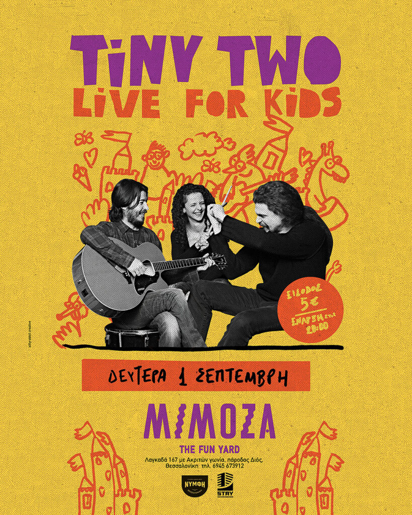Οι Tiny Two (acoustic cover band) παίζουν από το 2012 εντός κι εκτός Θεσσαλονίκης τραγούδια που διαχρονικά αγαπούν. Πρόσφατα όμως γεννήθηκε η ιδέα για κάτι διαφορετικό. Τα υλικά της ιδέας αυτής είναι τραγούδια που απευθύνονται σε παιδιά αλλά αγαπούν να ακούν κι οι γονείς (ο μάγειρας, αν ήταν ένας ποντικός, μάσα σιδερομάσα) καθώς και τραγούδια για ενήλικες που όμως αρέσουν και στα παιδιά (δεν είμαστε καλά, θα κάτσω σπίτι, yellow submarine). Μια διαδραστική συναυλία που επιδιώκει να διασκεδάσει όλες τις ηλικίες!