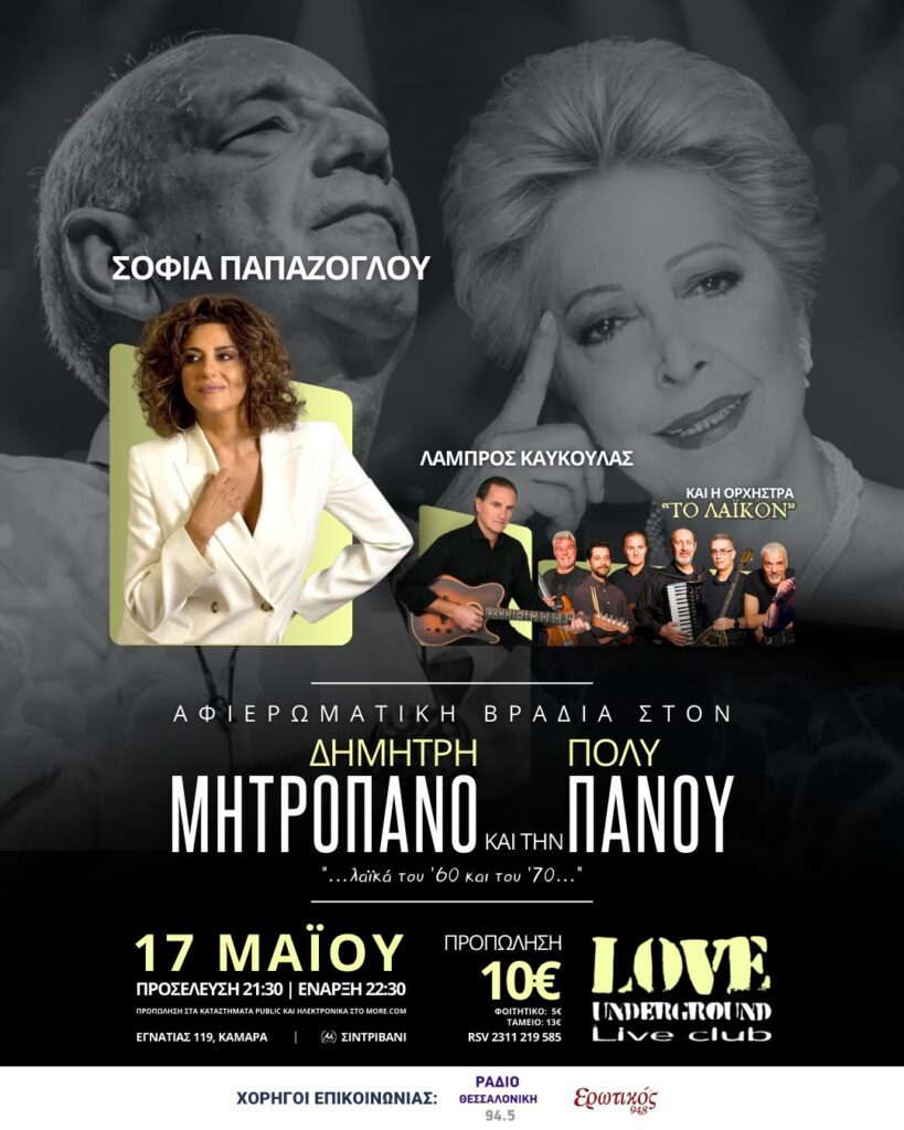 Το Σάββατο 17 Μαΐου η ορχήστρα «ΤΟ ΛΑΪΚΟΝ» επιστρέφει επαναλαμβάνοντας , μετά από δική σας απαίτηση το αφιέρωμα στον τεράστιο Δημήτρη Μητροπάνο και με την προσθήκη της Σοφίας Παπάζογλου μας θυμίζουν και τις μεγάλες επιτυχίες της μοναδικής Πόλυ Πάνου . Δύο μεγάλες φωνές η Σοφία Παπάζογλου και ο Λάμπρος Καυκoύλας αποδίδουν φόρο τιμής σε δύο μεγάλους καλλιτέχνες . Τα στιγμιότυπα των μεγάλων τραγουδιστών, πλαισιώνονται με μεγάλες επιτυχίες του Λαϊκού μας τραγουδιού από τις δεκαετίες 60 κ 70. Ελάτε να πονέσουμε , να θυμηθούμε, να γλεντήσουμε όπως τότε μόνο γνώριζαν. Λαϊκά κι αυθεντικά.