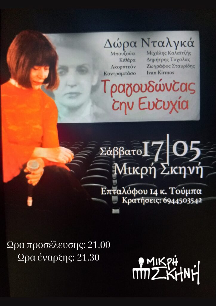 Στην Μικρή Σκηνή Επταλόφου 14 Κάτω Τούμπα και ώρα 9.30 στις 17 του Μάη ή Δώρα Νταλγκά τραγούδι, ο Μιχάλης Καλαϊτζής στο μπουζούκι,ο Δημήτρης Τυχάλας στην κιθάρα, ο Ζωγράφος Σταυρίδης στο ακορντεόν καί ό Ιβάν Κύρμος σάς περιμένουν νά ζωντανέψουμε αναμνήσεις πού έχουν χτιστεί με τά τραγούδια τής Ευτυχίας να την μνημονεύσουμε και να την ευχαριστήσουμε για τα μνημεία πού άφησε στον λαϊκό μας πολιτισμό. Θα μείνουν για πάντα πάγιες αξίες στην καρδιά μας.