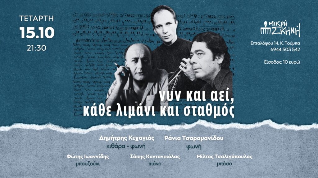 Τετάρτη 15 Οκτωβρίου | Μικρή Σκηνή (Επταλόφου 14, Κάτω Τούμπα) | Ώρα προσέλευσης: 21:00 | Ώρα έναρξης: 21:30 | Τιμή εισόδου: 10€ | Κρατήσεις: 6944503542
