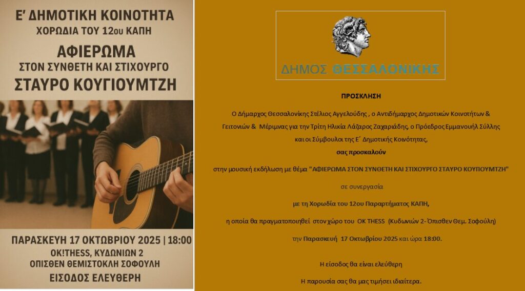 Το Βαφοπούλειο Πνευματικό Κέντρο του Δήμου Θεσσαλονίκης διοργανώνει συναυλία με τίτλο «Χρήστος Ζώτος. Αφιέρωμα στον αείμνηστο Δάσκαλο & δεξιοτέχνη του λαούτου», σε συνεργασία με τους μουσικούς κ. Σταύρο Παπασταύρου και κ. Παναγιώτη Σάκκουλα, μαθητές του Χρήστου Ζώτου, την Πέμπτη 16 Οκτωβρίου 2025, ώρα 20.00, στο Βαφοπούλειο Πνευματικό Κέντρο (Αίθουσα Θεάτρου, Γ. Βαφοπούλου 3-5).