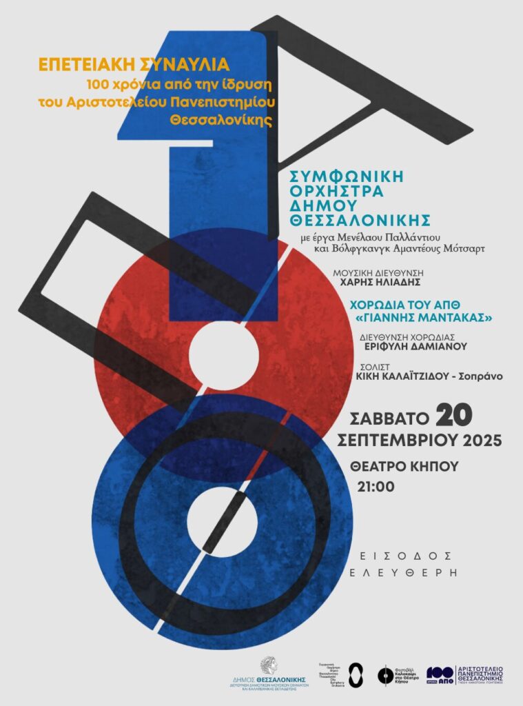 Η Συμφωνική Ορχήστρα Δήμου Θεσσαλονίκης τιμά τα 100 χρόνια από την Ίδρυση του Αριστοτελείου Πανεπιστημίου Θεσσαλονίκης με μια μεγάλη συναυλία στο Δημοτικό Θέατρο Κήπου με τη συμμετοχή της Χορωδίας του ΑΠΘ «Γιάννης Μάντακας».
