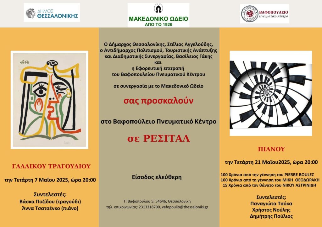 Ρεσιτάλ πιάνου, την Τετάρτη 21 Μαΐου 2025, στις 20:00, στο θέατρο του ΒΠΚ, σε συνεργασία με το Μακεδονικό Ωδείο. Το επετειακό ρεσιτάλ πιάνου θα γίνει με αφορμή τη συμπλήρωση 100 χρόνων από τη γέννηση των Μίκη Θεοδωράκη και Pierre Boulez, αλλά και 15 χρόνων από τον θάνατο του Νίκου Αστρινίδη. Κοινά στοιχεία των τριών είναι ότι εκπροσωπούν τρεις τάσεις (Μουσική Πρωτοπορία, Εμπρεσιονισμός, Ελληνική Εθνική Σχολή) και έζησαν την ίδια εποχή στο Παρίσι (μέσα του 20ου αιώνα) με γέφυρα τον Γάλλο συνθέτη Olivier Messiaen.
