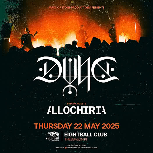 Το progressive rock / metal κουιντέτο από την Σκωτία, DVNE και το ελληνικό post / prog / sludge σχήμα των Allochiria, αναχωρούν για μία περιοδεία στην Ανατολική Ευρώπη την Άνοιξη του 2025. Επηρεασμένοι για την ονομασία του σχήματος από το αριστούργημα του συγγραφέα Frank Herbert και από την εμμονική τους αγάπη για την επιστημονική φαντασία, οι DVNE χτίζουν την φήμη τους σταθερά και ανοδικά από την κυκλοφορία του δεύτερου σε σειρά καλειδοσκοπικού και υπνωτιστικού δισκογραφικού δημιουργήματός τους -και πρώτου υπό την στέγη του θρυλικού label της Metal Blade- Etemen Ænka.