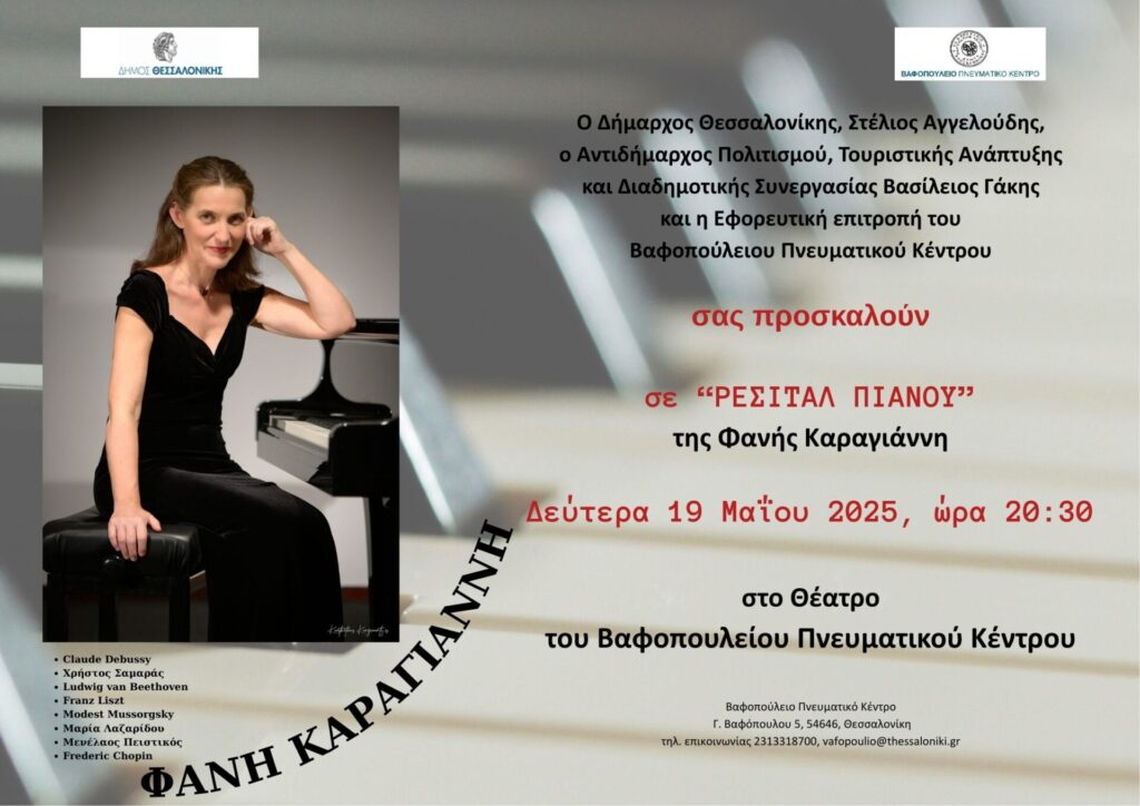 Ρεσιτάλ πιάνου με τίτλο «Resonance of Impression», τη Δευτέρα 19 Μαΐου 2025, στις 20:30, στο θέατρο του ΒΠΚ, με τη Φανή Καραγιάννη σε έργα των Claude Debussy, Χρήστος Σαμαράς, Ludwig van Beethoven, Franz Liszt, Modest Mussorgsky, Μαρίας Λαζαρίδου, Μενέλαου Πειστικού και Frederic Chopin.