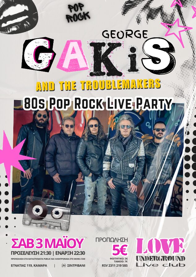 Ο Γιώργος Γάκης και οι Troublemakers, γνωστοί και αγαπημένοι για πολλα χρονια στο κοινό της Θεσσαλονίκης, σας προσκαλούν σε ένα μοναδικό live party μια επιστροφή στην μαγική εποχή των 80’s, συνδυάζοντας τις μεγαλύτερες pop και Rock επιτυχίες, για πρώτη φορά Θεσσαλονίκη, στο Love Underground, το Σάββατο 3 Μαΐου, για μόνο μια εμφάνιση!