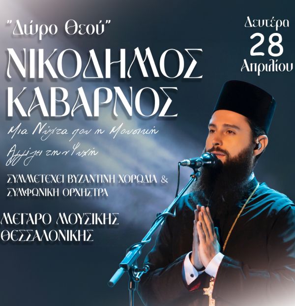 Μετά τις δύο sold-out εμφανίσεις του στην Αθήνα και μία στη Θεσσαλονίκη, που μάγεψαν το κοινό τα Χριστούγεννα, ο π. Νικόδημος επιστρέφει στη Θεσσαλονίκη για μια μοναδική μουσική εμπειρία, τη Δευτέρα 28 Απριλίου. Ένα ταξίδι πέρα από τον χρόνο, γεμάτο από τις πιο αγαπημένες και συγκινητικές μελωδίες των ύμνων που μας συντροφεύουν και ενώνουν γενιές και πολιτισμούς. Σε μια ατμόσφαιρα ονειρική και καθηλωτική, η φωνή του δημιουργεί μια εμπειρία που υπερβαίνει τα σύνορα της μουσικής.