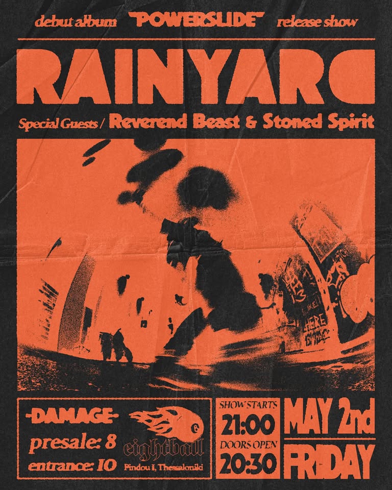 Οι Rainyard είναι μία νεοσύστατη rock μπάντα με έδρα τη Θεσσαλονίκη, που αντλεί τη βασική της έμπνευση από την ακατέργαστη, αφιλτράριστη ενέργεια του grunge του Seattle της δεκαετίας του ’90. Ο ήχος τους υφαίνει επίσης στοιχεία από hard rock, post-punk και metal συγκροτήματα που καθόρισαν τα τέλη της δεκαετίας του ’80. Με δύο single που έχουν ήδη κυκλοφορήσει – “Irene” και “Addiction” – το συγκρότημα είναι έτοιμο για την κυκλοφορία του ντεμπούτου άλμπουμ τους, Powerslide στις 20 Απριλίου.