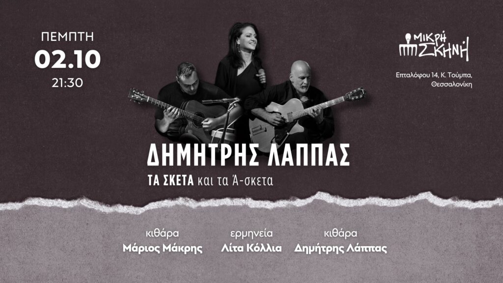 Παρασκευή 3 Οκτωβρίου | Μικρή Σκηνή (Επταλόφου 14, Κάτω Τούμπα) | Ώρα προσέλευσης: 22:00 | Ώρα έναρξης: 22:30 | Είσοδος: 10€ | Κρατήσεις: 6944503542