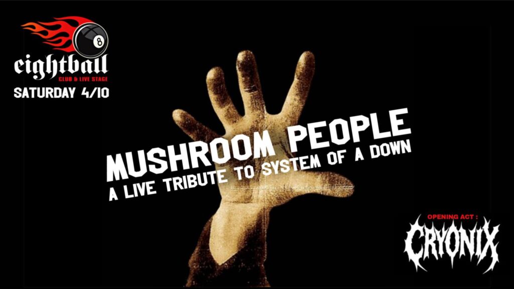 Οι Mushroom People, η απόλυτη cover μπάντα των System of a Down επιστρέφει στο Eightball, με την ενέργεια, τις μουσικές ικανότητες και την ατμόσφαιρα που αγαπάμε στο αυθεντικό συγκρότημα!
