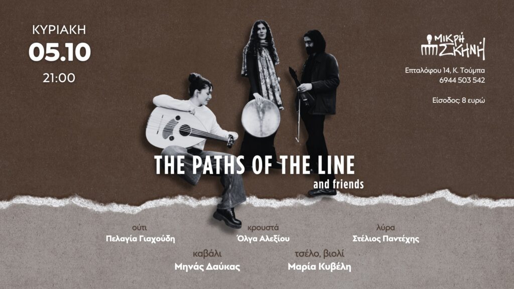 Το μουσικό project “The Paths of the Line” αποτελείται από τους Πελαγία Γιαχούδη (ούτι), Όλγα Αλεξίου (κρουστά) και Στέλιο Παντέχη (λύρα). Οι τρεις μουσικοί γνωρίστηκαν στο Πανεπιστήμιο και συνεργάστηκαν σε διάφορα projects και συναυλίες, τόσο από κοινού όσο και σε ατομικό επίπεδο. Με τις διαφορετικές εμπειρίες και τα ενδιαφέροντά τους, σε αυτό το project αναζητούν έναν κοινό ήχο, εξερευνώντας τα “μονοπάτια της γραμμής” όπως τα αντιλαμβάνονται.