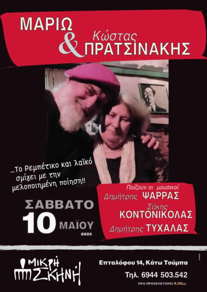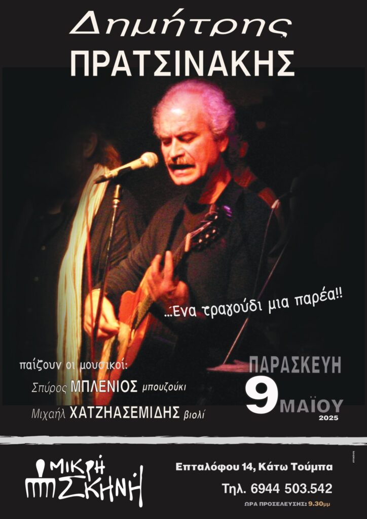 Την Παρασκευή 9 Μαίου ο Δημήτρης Πρατσινακη εμφανίζεται στο φιλόξενο χώρο της Μικρης Σκηνής στην Κ. Τούμπα, παρέα με τους νέους μουσικούς Σπύρο Μπλένιο και Μιχαήλ Χατζηασεμίδη.