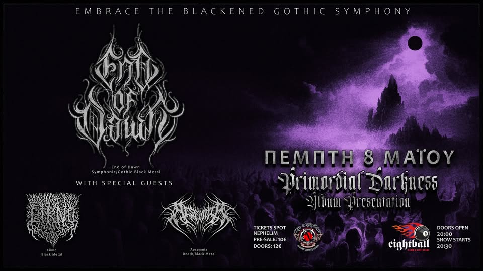 Οι Symphonic/Gothic Black Metallers End of Dawn λίγο μετά την κυκλοφορία του ντεμπούτου άλμπουμ “Primordial Darkness”, παρουσιάζουν στο κοινό της Θεσσαλονίκης τα νέα τους τραγούδια. Μαζί τους οι Likno (Black Metal) από την Κοζάνη και οι Aesemnia (Death/Black Metal) από την Θεσσαλονίκη.