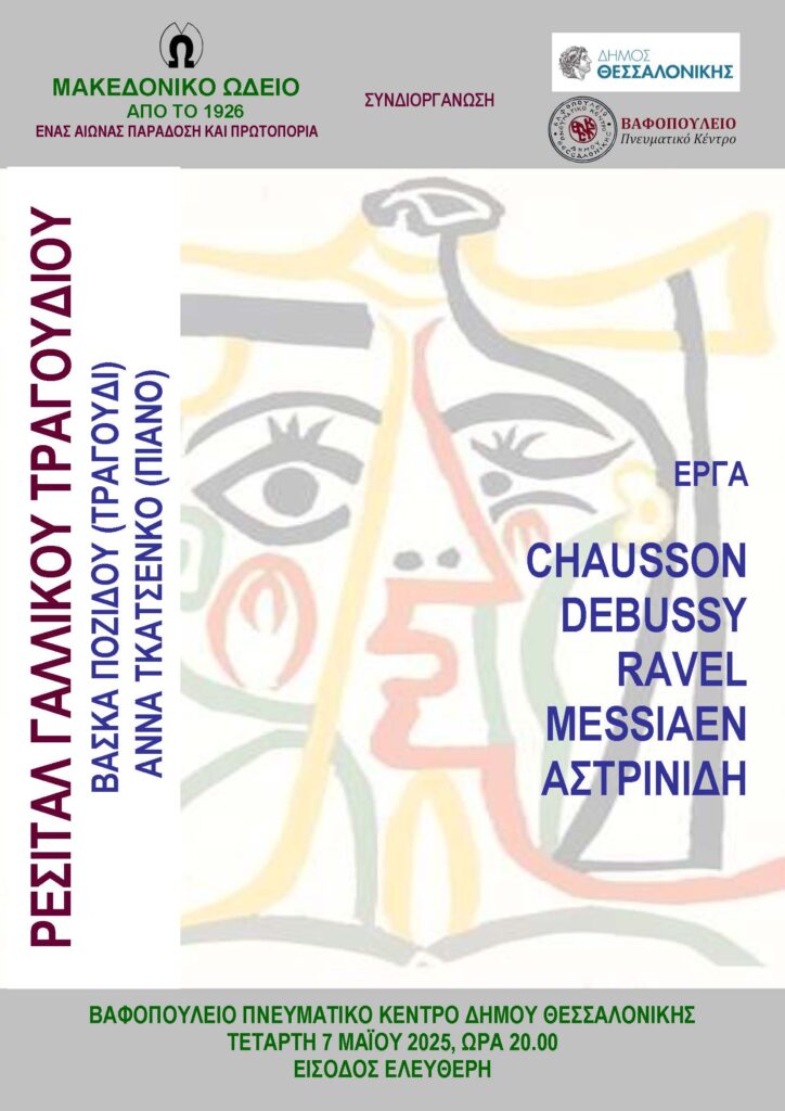 Το Μακεδονικό Ωδείο και το Βαφοπούλειο Πνευματικό Κέντρο του Δήμου Θεσσαλονίκης στο πλαίσιο των πολιτιστικών δραστηριοτήτων τους οργανώνουν ρεσιτάλ γαλλικού τραγουδιού της Βάσκας Ποζίδου (τραγούδι) και Άννας Τκατσένκο (πιάνο) την Τετάρτη 7 Μαΐου 2025, ώρα 20.00 στο Βαφοπούλειο Πνευματικό Κέντρο του Δήμου Θεσσαλονίκης (Βαφοπούλου 5, 546 46 Θεσσαλονίκη).
