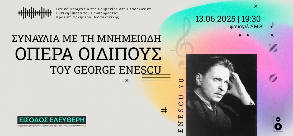 Με την ευκαιρία της συμπλήρωσης 70 χρόνων από τον θάνατο του συνθέτη George Enescu και της 40ής χρονιάς εορτασμού της Ευρωπαϊκής Ημέρας Μουσικής (21 Ιουνίου), το Γενικό Προξενείο της Ρουμανίας στη Θεσσαλονίκη, με την υποστήριξη της Εθνικής Όπερας του Βουκουρεστίου και της Κρατικής Ορχήστρας Θεσσαλονίκης, τιμά τον μεγάλο συνθέτη παρουσιάζοντας αποσπάσματα από τη μνημειώδη όπερά του «Οιδίπους» στο Αρχαιολογικό Μουσείο Θεσσαλονίκης.