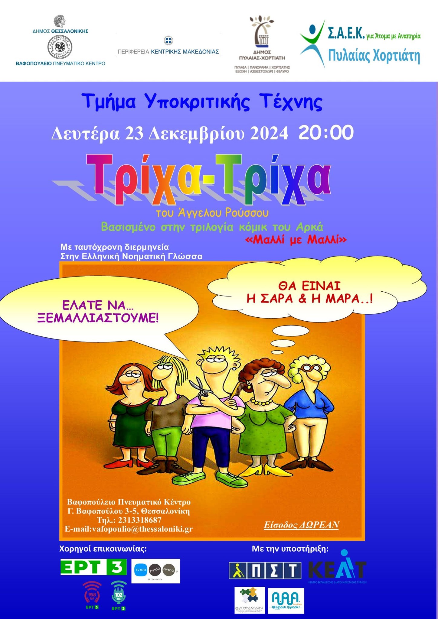 Το Βαφοπούλειο Πνευματικό Κέντρο του Δήμου Θεσσαλονίκης, ο Δήμος Πυλαίας-Χορτιάτη και η Αντιπεριφέρεια Πολιτισμού και Αθλητισμού Κεντρικής Μακεδονίας σε συνεργασία με το τμήμα «Υποκριτικής Τέχνης» της Σχολής Ανώτερης Επαγγελματικής Κατάρτισης (ΣΑΕΚ) Πυλαίας-Χορτιάτη για Άτομα με Αναπηρία παρουσιάζουν την κωμωδία «Τρίχα-Τρίχα», βασισμένη στην τριλογία κόμικ «Μαλλί με Μαλλί» του γνωστού σκιτσογράφου και συγγραφέα Αρκά.
