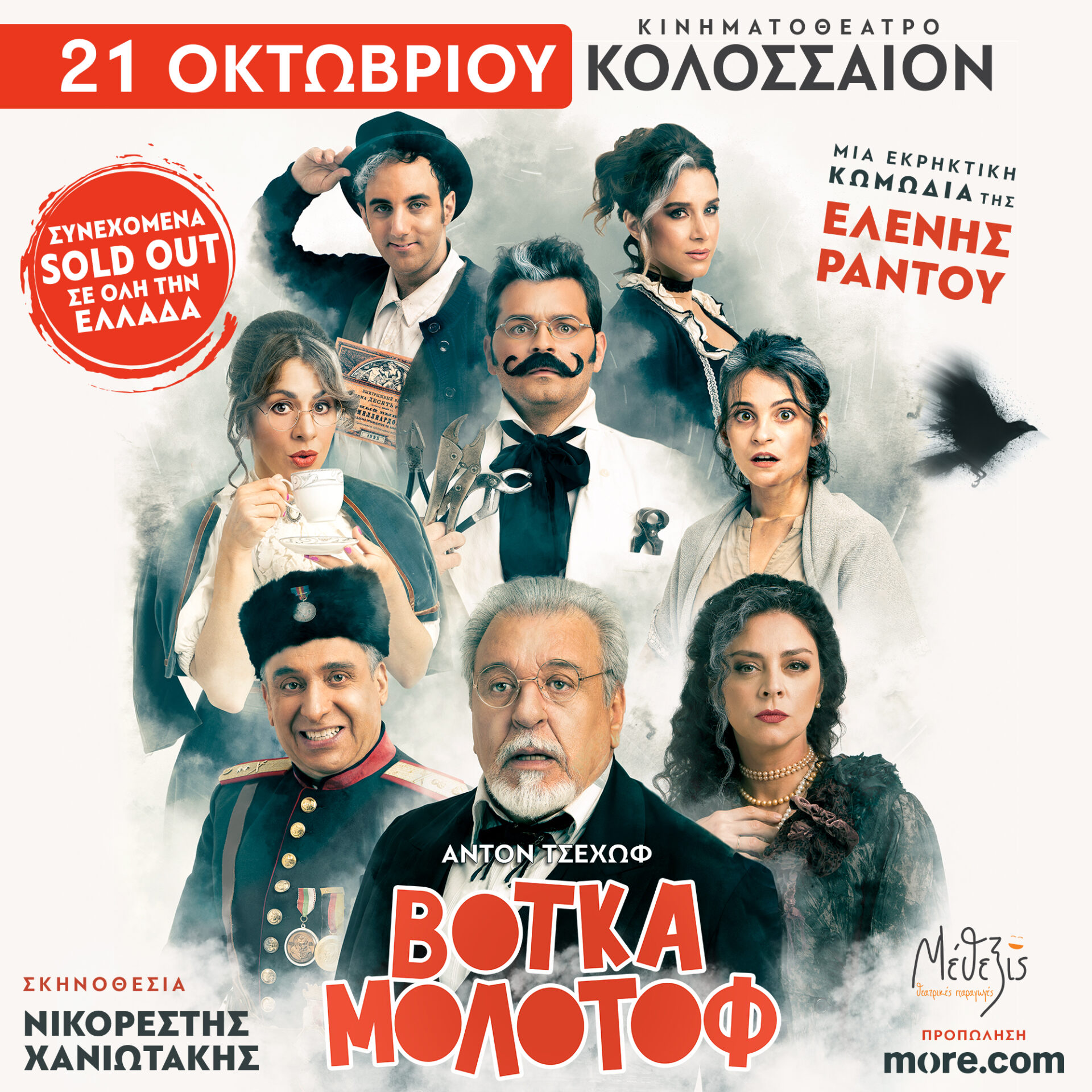 Η παράσταση «Βότκα Μολότοφ», η θεατρική κωμωδία της Ελένης Ράντου, βασισμένη στη διασκευή του Νηλ Σάιμον πάνω στα διηγήματα του Τσέχωφ, που την απολαύσαμε στη σκηνή του Κινηματοθέατρου Κολοσσαίον στη Θεσσαλονίκη, επιστρέφει για μία ακόμη παράσταση τον Οκτώβριο του 2024.