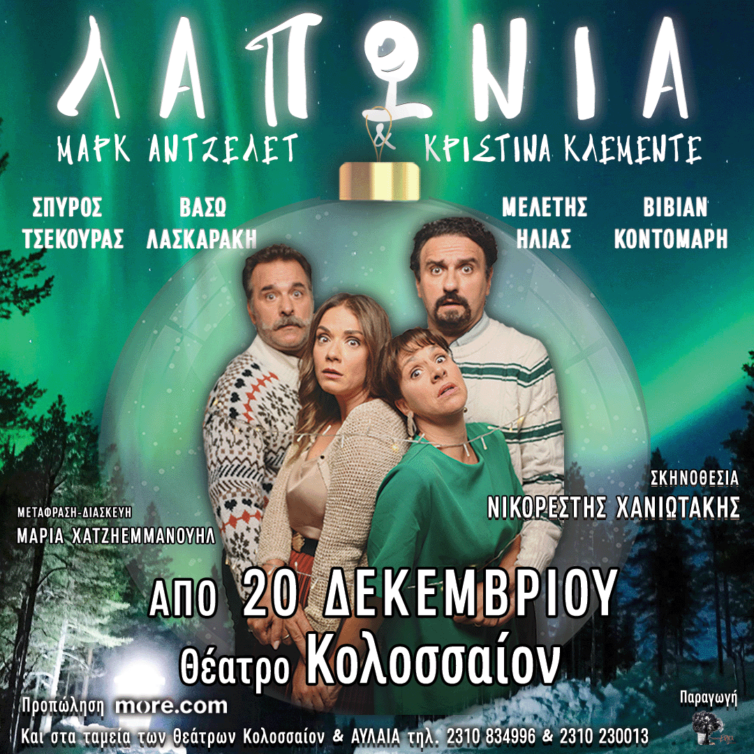 Δύο οικογένειες συναντιούνται στη Λαπωνία για να γιορτάσουν τα Χριστούγεννα. Όμως η χαρούμενη ατμόσφαιρα διαταράσσεται όταν ένα απ’ τα παιδιά λέει στο άλλο ότι ο Άγιος Βασίλης είναι ένα ψέμα που δημιουργούν οι μαμάδες κι οι μπαμπάδες! Και τότε οι γονείς τους καλούνται να βγάλουν το φίδι απ’ την τρύπα… Η «Λαπωνία» είναι μία σύγχρονη κωμωδία που ανεβαίνει για πρώτη φορά στην χώρα μας, κάνοντας πρεμιέρα την Παρασκευή 20 Δεκεμβρίου στο Θέατρο Κολοσσαίον.