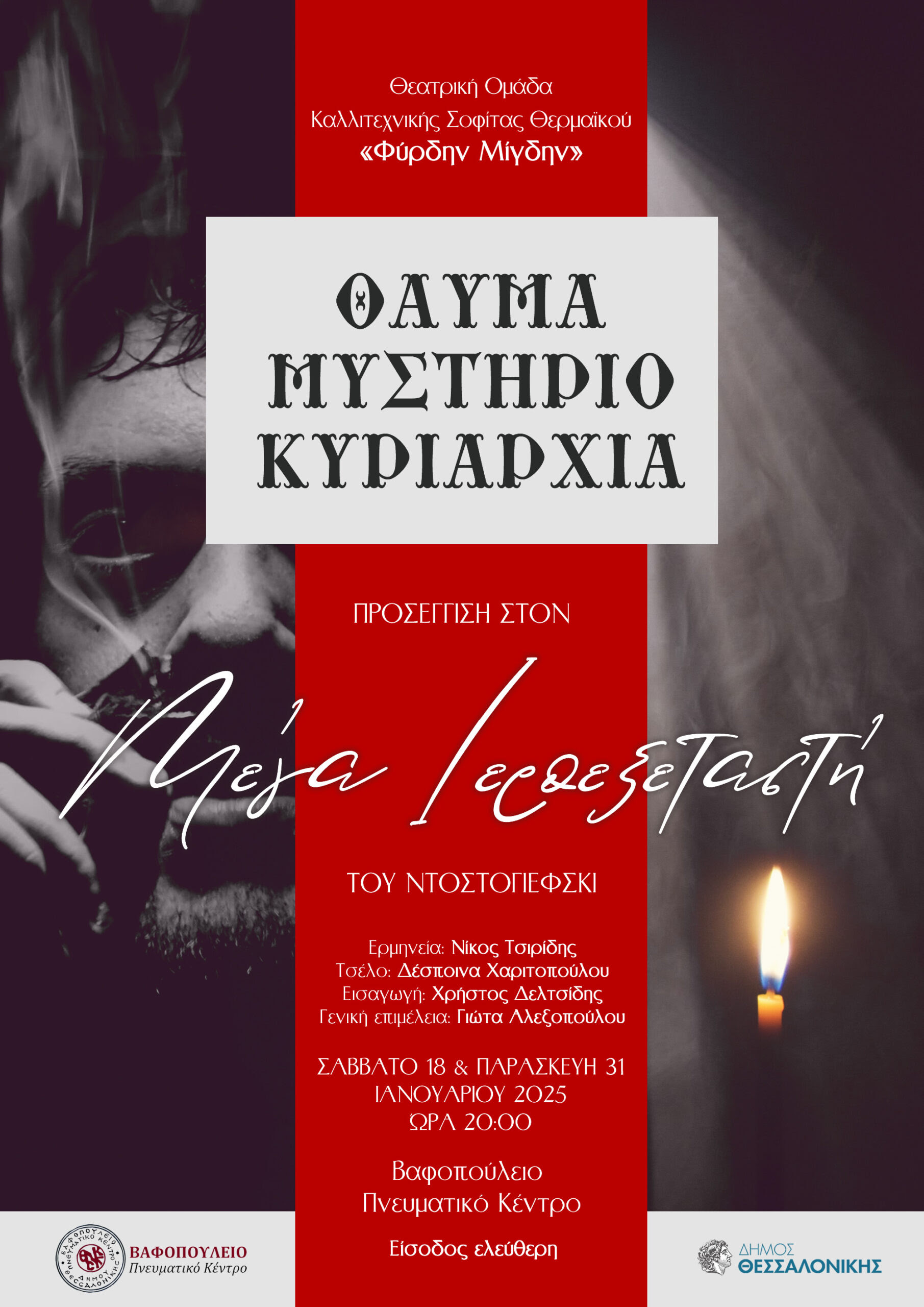 Το Βαφοπούλειο Πνευματικό Κέντρο σε συνεργασία με τη θεατρική ομάδα «Φύρδην Μίγδην» της Καλλιτεχνικής Σοφίτας Θερμαϊκού (ΚΑ.ΣΟ.ΘΕ.), διοργανώνουν τις θεατρικές παραστάσεις με τίτλο «Θαύμα-Μυστήριο-Κυριαρχία: Προσέγγιση στο «Μέγα Ιεροεξεταστή» του Φ. Ντοστογιέφσκι και «Σημειώσεις που κράτησα για τη ζωή», το δίμηνο Ιανουαρίου-Φεβρουαρίου 2025.