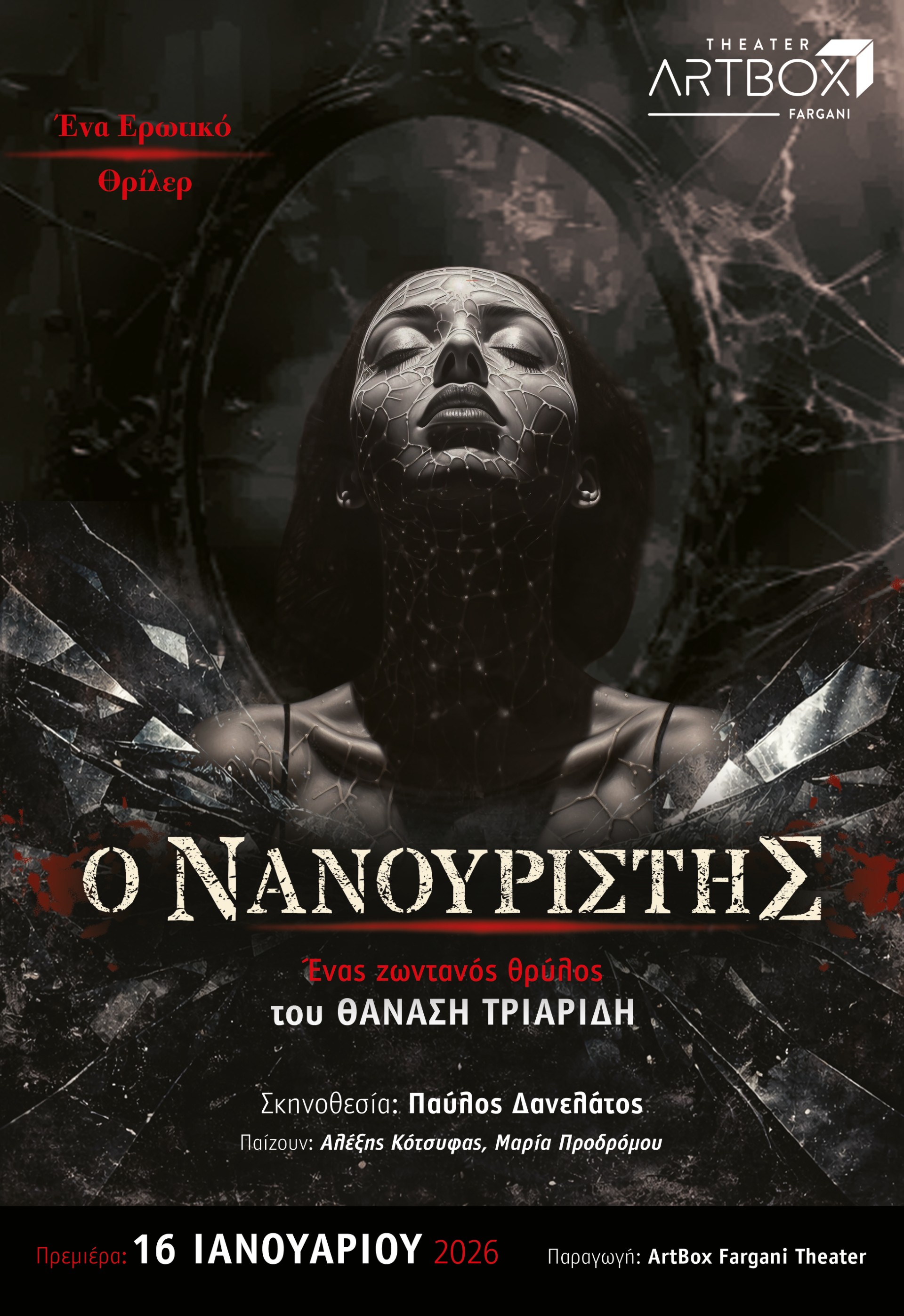 Συντελεστές: Σκηνοθεσία & Μουσική επιμέλεια: Παύλος Δανελάτος | Σκηνικά: Απόστολος Αποστολίδης | Κοστούμια: Μαρία Καβαλιώτη | Παίζουν: Μαρία Προδρόμου, Αλέξης Κότσυφας | Παραγωγή: ArtBox Fargani Theater