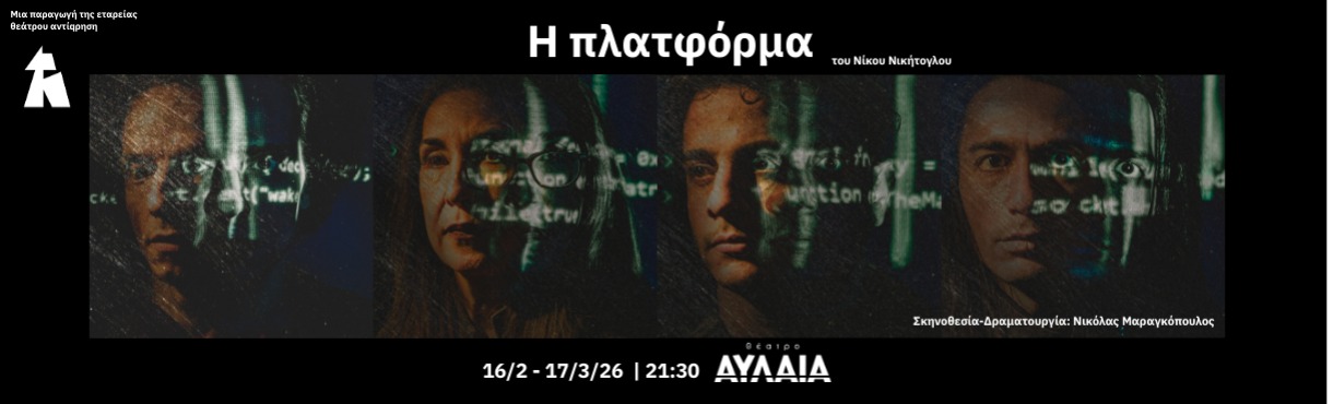 Η εταιρεία θέατρου αντίqρηση παρουσιάζει το έργο η πλατφόρμα, ένα σύγχρονο τρίπρακτο χωρίς «κουμπί επανεκκίνησης», του Νίκου Νικήτογλου, σε σκηνοθεσία Νικόλα Μαραγκόπουλου.