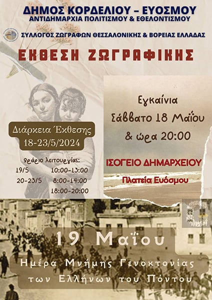 Τα εγκαίνια της έκθεσης, που εντάσσονται στις εκδηλώσεις μνήμης των θυμάτων της Γενοκτονίας των Ελλήνων του Πόντου, θα τελεστούν το Σάββατο 18 Μαΐου στις 20:00, στο ισόγειο του δημαρχείου Κορδελιού-Ευόσμου.