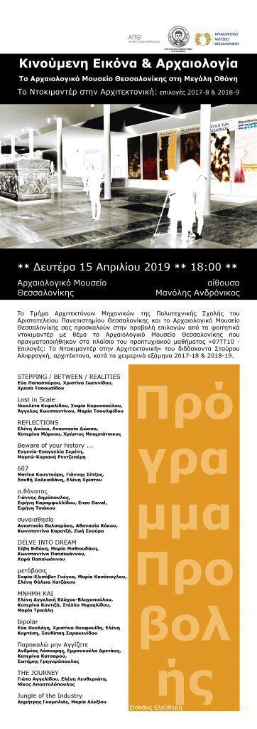 To Τμήμα Αρχιτεκτόνων Μηχανικών της Πολυτεχνικής Σχολής του Αριστοτελείου Πανεπιστημίου Θεσσαλονίκης και το Αρχαιολογικό Μουσείο Θεσσαλονίκης σας προσκαλούν στην προβολή επιλογών από τα φοιτητικά ντοκιμαντέρ με θέμα το Αρχαιολογικό Μουσείο Θεσσαλονίκης που πραγματοποιήθηκαν στο πλαίσιο του προπτυχιακού μαθήματος «07ΤΤ10 – Επιλογές: Το Ντοκιμαντέρ στην Αρχιτεκτονική» του διδάσκοντα Σταύρου Αλιφραγκή, αρχιτέκτονα μηχανικού, κατά τα χειμερινά εξάμηνα 2017-18 & 2018-19.