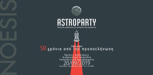 Το ΝΟΗΣΙΣ σας προσκαλεί στην ετήσια, ανοιχτή για το κοινό εκδήλωση “Astroparty 2019”, την Παρασκευή 20 Σεπτεμβρίου 2019, από τις 16:00. Επισκεφτείτε τους χώρους μας και απολαύστε μια ποικιλία δραστηριοτήτων, για όλες τις ηλικίες, από το πεδίο των επιστημών και της τεχνολογίας. Γνωρίστε το ΝΟΗΣΙΣ, ως έναν πολυχώρο άτυπης εκπαίδευσης, όπου η επιστήμη συνδυάζεται με τη βιωματική εμπειρία και η γνώση με την ψυχαγωγία. Φέτος, συμπληρώνονται 50 χρόνια από την κατάκτηση της Σελήνης και στο πλαίσιο της επετείου αυτής οι περισσότερες από τις δράσεις του Astroparty έχουν ανάλογο περιεχόμενο.