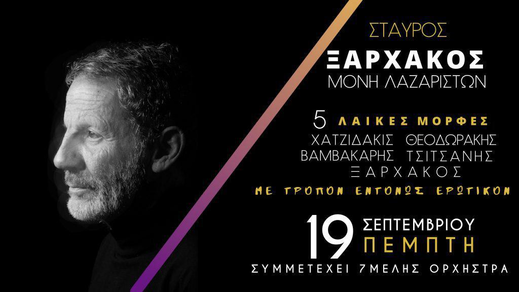 Ο Σταύρος Ξαρχάκος, θα μας χαρίσει μια ξεχωριστή βραδιά, την Πέμπτη 19 Σεπτεμβρίου, στις 21.30, στo Φεστιβάλ Μονής Λαζαριστών, όπου θα μας παρουσιάσει τη συγκλονιστική συναυλία «5 Λαϊκές Μορφές Με Τρόπον Εντόνως Ερωτικόν», ένα ξεχωριστό και σπάνιο αφιέρωμα που ενώνει τη νεότερη μουσική ιστορία της χώρας.