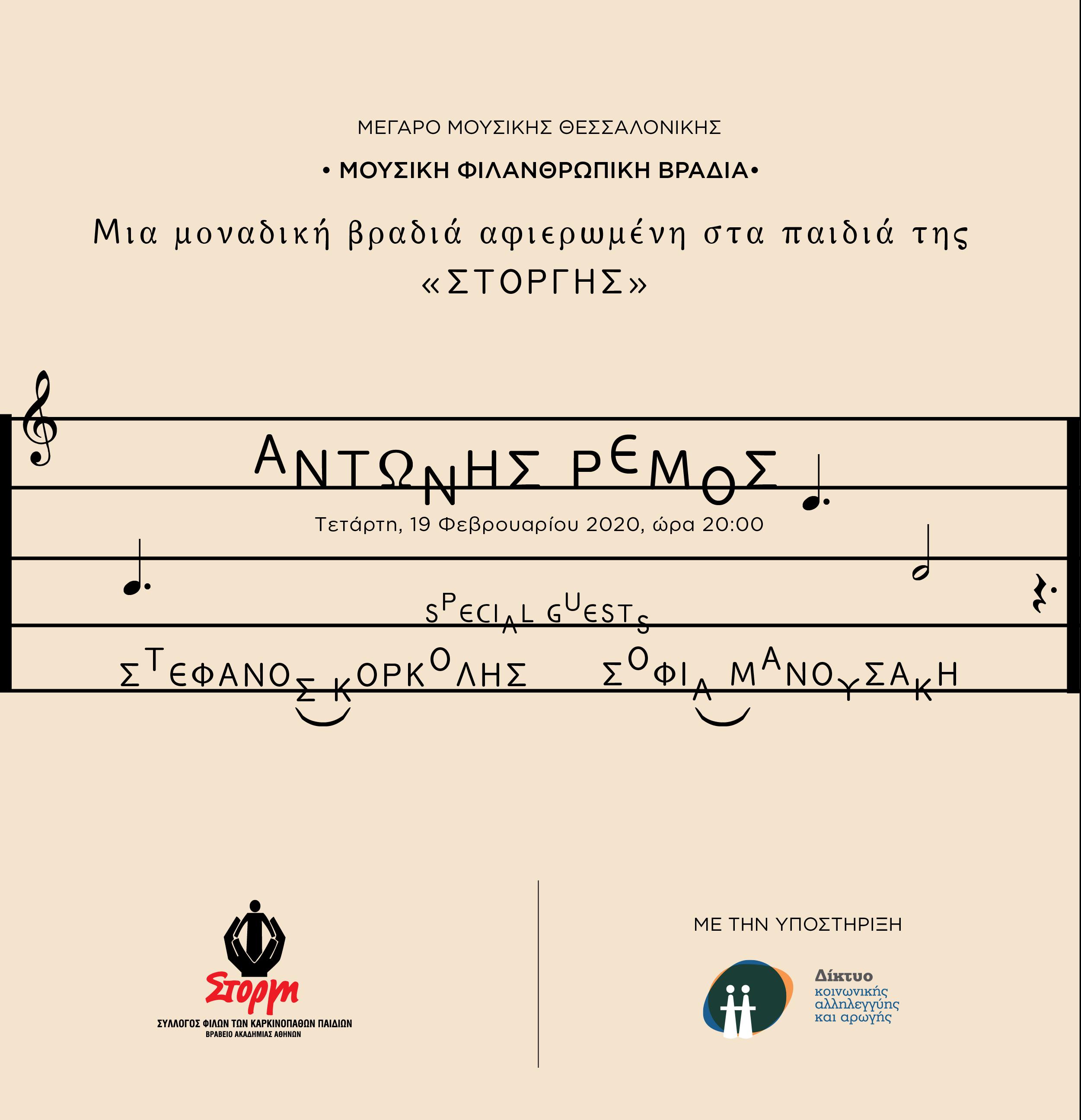Ο Σύλλογος Φίλων των Καρκινοπαθών Παιδιών “ΣΤΟΡΓΗ” με την υποστήριξη του Δικτύου Κοινωνικής Αλληλεγγύης και Αρωγής διοργανώνει μία μοναδική μουσική βραδιά αφιερωμένη στα παιδιά της “ΣΤΟΡΓΗΣ” ενώνοντας τη φωνή του αγαπημένου Θεσσαλονικιού καλλιτέχνη Αντώνη Ρέμου με τις μουσικές του μεγάλου Έλληνα σύγχρονου συνθέτησ Στέφανου Κορκολή, την Τετάρτη 19 Φεβρουαρίου 2020, ώρα 20.00 στην Αίθουσα Φίλων Μουσικής. Ο Αντώνης Ρέμος θα ερμηνεύσει μερικές διαχρονικές επιτυχίες τους διεθνούς φήμης συνθέτου και πιανίστα Στέφανου Κορκολή και άλλων καταξιωμένων συνθετών. Μαζί τους η εξαιρετική Σοφία Μανουσάκη.