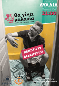 Ο Δημήτρης Χριστοφορίδης, ένας από τους καλύτερους stand up comedians της χώρας, παρουσιάζει την τρίτη σόλο του παράσταση «Θα γίνει μαλακία» και μας διηγείται με το χαρακτηριστικό χιούμορ του-πασπαλισμένο με δόσεις αυτοσαρκασμού αλλά και τρυφερότητας, καταστάσεις της δική του ζωής που κάτι θυμίζουν από τη δική μας.