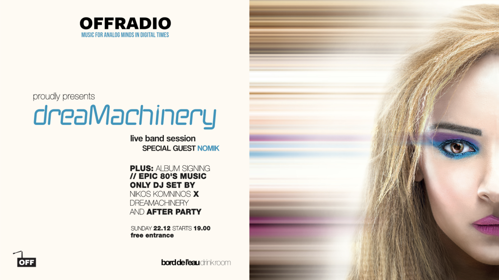 Στo Offradio κλείνουν τη χρονιά με έναν από τους δίσκους της χρονιάς και τον παρουσιάζουν με ένα μοναδικό ηλεκτρονικό live από τον Dreamachinery και το συγκρότημά του ζωντανά στο Bord Del’ Eau. Θα ακολουθήσει after party γεμάτο epic 80s music only με τη σφραγίδα του OFF. Και καθώς πια δεν βγαίνουν τόσο συχνά τέτοιες δισκάρες μέσα από την πόλη της Θεσσαλονίκης, την Κυριακή 22 Δεκεμβρίου το κοινό της πόλης καλείται να απολαύσει Dreamachinery μαζί μας ζωντανά με τη μπάντα του και τον Nomik που δίνει τη φωνή και τους στίχους στο αγαπημένο όλων μας single “Kids on the rainbow”.
