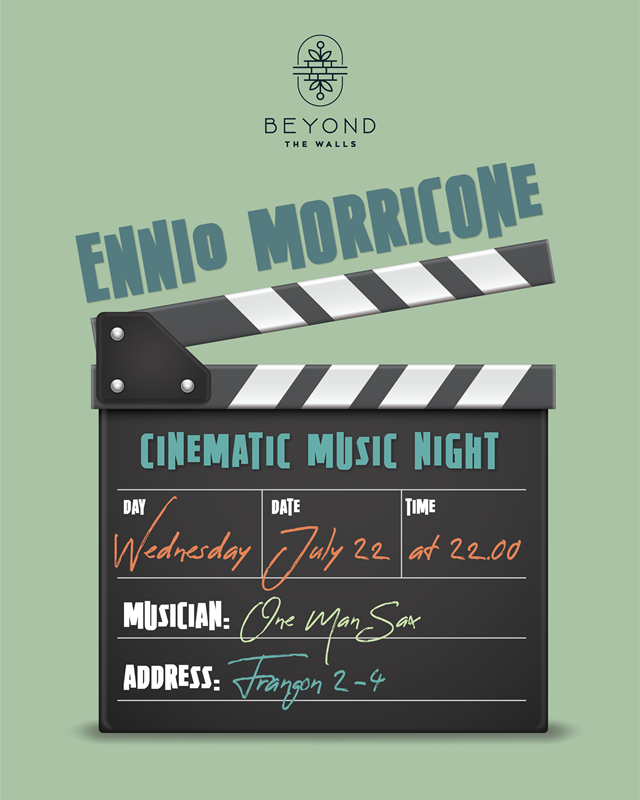 H αγαπημένη μας καλοκαιρινή αυλή του Beyond the Walls θα πλημμυρίσει με soundtracks επικών κινηματογραφικών ταινιών σε ένα μουσικό αφιέρωμα στον θρυλικό μαέστρο και συνθέτη Ennio Morricone. Πρωταγωνιστές το σαξόφωνο και το πιάνο που με τις νότες τους θα σε συντροφεύσουν πλάι στα τείχη. Μελωδίες από το Σινεμά ο Παράδεισος, Ο καλός, ο κακός και ο άσχημος, Για μια χούφτα δολάρια και πολλές άλλες θα σου προσφέρουν μία μοναδική βραδιά.