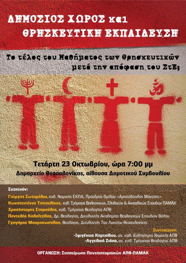 ΟΡΓΑΝΩΣΗ: Συσπείρωση Πανεπιστημιακών ΑΠΘ-ΠΑΜΑΚ ΘΕΜΑ: Δημόσιος χώρος και θρησκευτική εκπαίδευση. Το τέλος του Μαθήματος των Θρησκευτικών μετά την απόφαση του ΣτΕ;