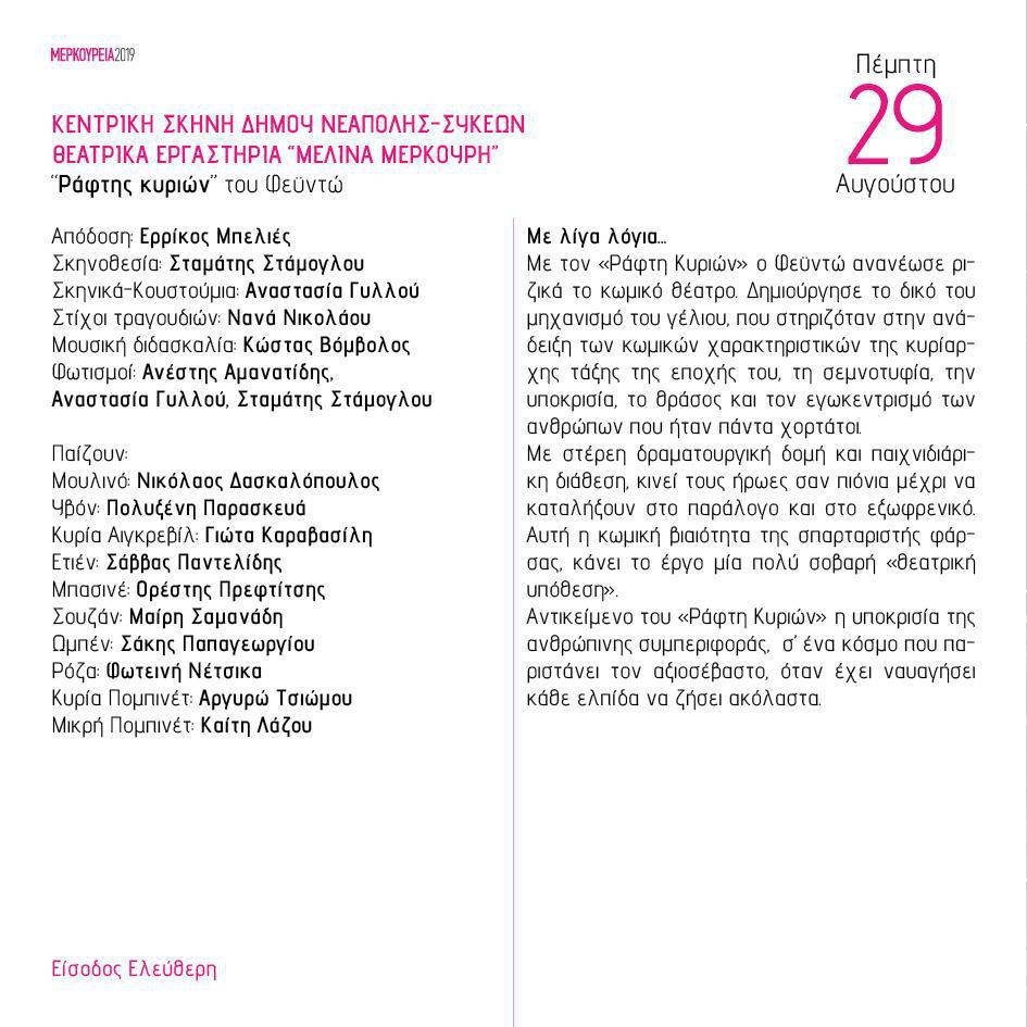 *Από τις 28 έως τις 31 Αυγούστου 2019 στον αύλειο χώρο του Κέντρου πολιτισμού Σίνδου. Η τελετή έναρξης την Τετάρτη 28 Αυγούστου 2019, στις 9 μ.μ, είσοδος ελεύθερη, περισσότερα ΕΔΩ