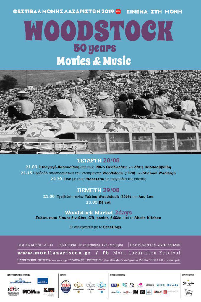 Επιστρέφουμε πάντα στο Woodstock γιατί το έχουμε ανάγκη. Το φεστιβάλ ήταν, μεταξύ άλλων, μία ηχηρή κραυγή του κινήματος των hippies ενάντια του πολέμου και του ρατσισμού. Μια γιορτή της αγάπης και της ειρήνης σε μία εποχή που αυτό επιβάλλονταν. Αυτό το γεγονός θέλουμε να θυμηθούμε μαζί 50 χρόνια μετά στον φιλόξενο χώρο της Μονής Λαζαριστών, την Τετάρτη 28 και την Πέμπτη 29 Αυγούστου, στις 21.00. Θα δούμε μαζί τις ωραιότερες και πιο ιστορικές στιγμές του Φεστιβάλ… Θα μάθουμε μερικές ιστορίες και φυσικά θα ακούσουμε μουσική.