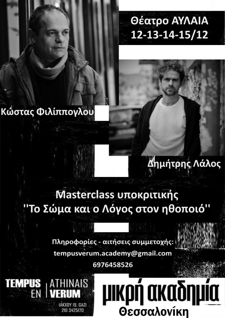 * 12-15 Δεκεμβρίου στο Θέατρο ΑΥΛΑΙΑ, (Πλατεία ΧΑΝΘ / Τσιμισκή) Ώρες: 14.00-19.00 Κόστος συμμετοχής: 195€ Αιτήσεις συμμετοχής: αποστολή βιογραφικού στο email: tempusverum.academy@gmail.com, Τηλέφωνο: 6976458526 / 2310 230013
