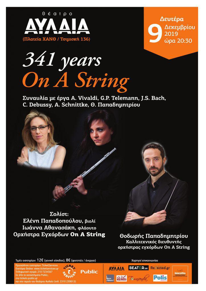 Η ορχήστρα δωματίου On A String της οποίας καλλιτεχνική επιμέλεια έχει ο μαέστρος, βιολοντσελίστας και συνθέτης Θοδωρής Παπαδημητρίου και οι σολίστ Ελένη Παπαδοπούλου στο βιολί και Ιωάννα Αθανασάκη στο φλάουτο, θα ερμηνεύσουν μουσικές συνθέσεις που χρονολογούνται από το 1678 μέχρι και σήμερα. Στη συναυλία θα ακουστούν έργα για βιολί, φλάουτο και ορχήστρα δωματίου των: AntonioVivaldi (1678-1741) GeorgPhilipTelemann (1681-1767) Johann Sebastian Bach (1685-1750) ClaudeDebussy (1862-1918) Alfred Schnittke (1934-1998) Θοδωρής Παπαδημητρίου (1978-).