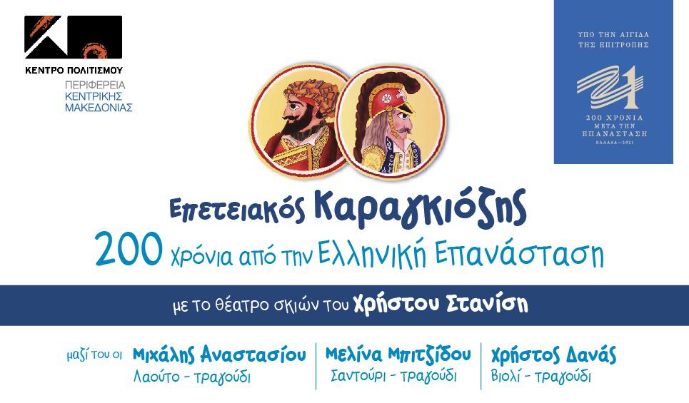 Το Κέντρο Πολιτισμού Περιφέρειας Κεντρικής Μακεδονίας με αφορμή τον εορτασμό των 200 χρόνων από την Επέτειο της Ελληνικής Επανάστασης και σε συνεργασία με Δήμους της Θεσσαλονίκης παρουσιάζουν τον «Επετειακό Καραγκιόζη- 200 Χρόνια από την Ελληνική Επανάσταση». Γνωστές και άγνωστες πτυχές, ντοκουμέντα και αναφορές σε μια σειρά ηρωικών παραστάσεων, βασισμένων σε ιστορικά γεγονότα της περιόδου της Ελληνικής Επανάστασης. Μπροστά από τα μάτια του θεατή παρελαύνουν όλοι οι Ήρωες της Επανάστασης και η σημαντική δράση τους παράλληλα με τους ήρωες του Θεάτρου Σκιών. Εξαιτίας της πολυπλοκότητας της σκηνικής δράσης, οι συγκεκριμένες παραστάσεις παρουσιάζονται σπάνια.