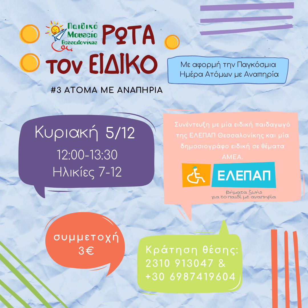 Στο πλαίσιο της Παγκόσμιας Ημέρας Ατόμων με Αναπηρία, η ΕΛΕΠΑΠ Θεσσαλονίκης ενώνει τις δυνάμεις της με το Παιδικό Μουσείο Θεσσαλονίκης και συμμετέχει στην εβδομαδιαία δράση του φορέα με τίτλο ΡΩΤΑ ΤΟΝ ΕΙΔΙΚΟ, η οποία θα πραγματοποιηθεί την Κυριακή 5 Δεκεμβρίου, ώρα 12:00-13:30.