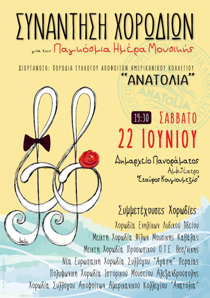 Η Χορωδία του Συλλόγου Αποφοίτων του Αμερικανικού Κολλεγίου Ανατόλια, με χαρά σας προσκαλεί στην Συνάντηση Χορωδιών με αφορμή την Παγκόσμια Ημέρα Μουσικής, που θα γίνει το Σάββατο 22 Ιουνίου 2019, στο Αμφιθέατρο “Σταύρος Κουγιουμτζής” του Δημαρχειακού Μεγάρου Πανοράματος, Θεσσαλονίκης.