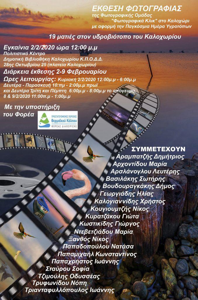 Με την έκθεση φωτογραφίας «19 ματιές στον υδροβιότοπο του Καλοχωρίου» θα τιμήσουμε φέτος την Παγκόσμια Ημέρα Υγροτόπων που γιορτάζεται κάθε χρόνο στις 2 Φεβρουαρίου. Η έκθεση υλοποιείται με τη συνδιοργάνωση της Δημοτικής Βιβλιοθήκης Καλοχωρίου του Κοινωνικού Πολιτιστικού Οργανισμού του Δήμου Δέλτα και της φωτογραφικής ομάδας «Φωτογραφικά Κλικ» καθώς και με την υποστήριξη του Φορέα Διαχείρισης Δέλτα Αξιού Λουδία Αλιάκμονα. Ο απαράμιλλης ομορφιάς υδροβιότοπος του Καλοχωρίου συγκεντρώνει μεγάλους πληθυσμούς από σπάνια και απειλούμενα είδη πουλιών σε ευρωπαϊκό και παγκόσμιο επίπεδο για τροφή και στάση κατά το μεταναστευτικό τους ταξίδι καθώς και άλλων ενδημικών ειδών της εγχώριας πανίδας.