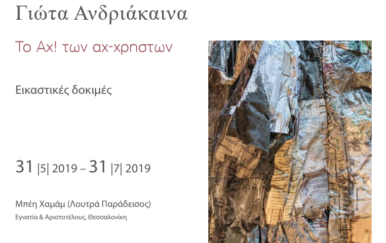 * Διάρκεια έκθεσης: 31 Μαΐου – 31 Ιουλίου 2019, Ωράριο έκθεσης: Δευτέρα – Παρασκευή: 10:00-14:00, Είσοδος: ελεύθερη, Πληροφορίες: 2310 226 931, 2310 204 868, 6944607568