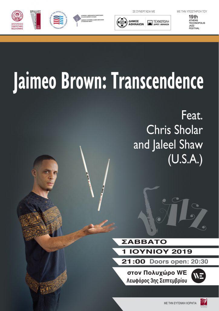 Μετά την πολύ επιτυχημένη συνεργασία τους στην εκδήλωση «Ο Jeffrey Eugenides στη Θεσσαλονίκη», τον Σεπτέμβριο του 2018, το Αριστοτέλειο Πανεπιστήμιο και το Γενικό Προξενείο των ΗΠΑ φέρνουν στη Θεσσαλονίκη νεοϋορκέζικο αέρα, με το μουσικό τζαζ σχήμα Jaimeo Brown Τrio και την παράσταση «Jaimeo Brown: Transcendence», το Σάββατο 1 Ιουνίου 2019.
