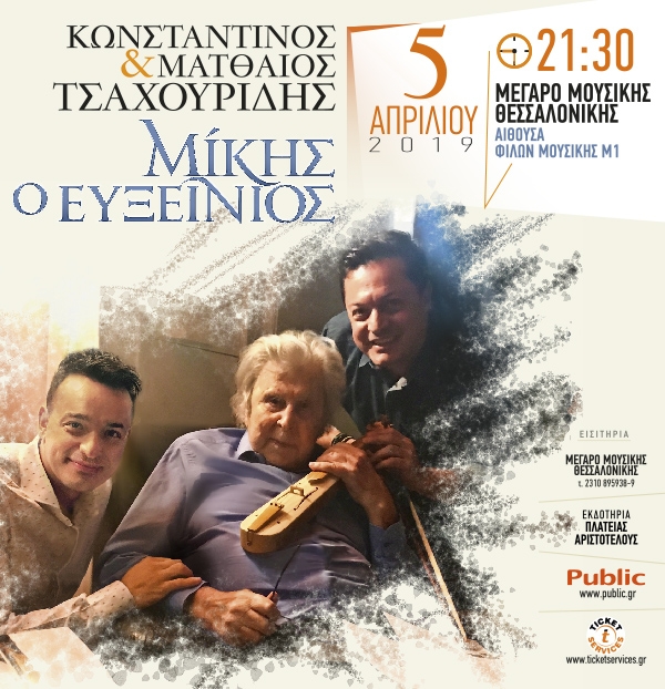 Μια διαφορετική προσέγγιση στα τραγούδια του Μίκη Θεοδωράκη πρόκειται να μας χαρίσουν οι αδελφοί Κωνσταντίνος και Ματθαίος Τσαχουρίδης στις 5 Απριλίου στην Αίθουσα Φίλων Μουσικής (κτίριο Μ1, Μέγαρο Μουσικής Θεσσαλονίκης). Με φωνή και με δοξάρι θα ακολουθήσουν μια ethnic μουσική διαδρομή πάνω σε μια επιλεγμένη ανθολογία τραγουδιών που έχουν προσεκτικά μελετήσει και δουλέψει από κοινού με τον συνθέτη.